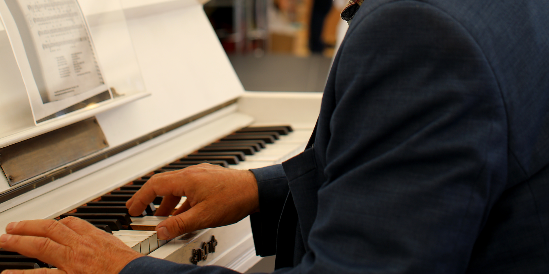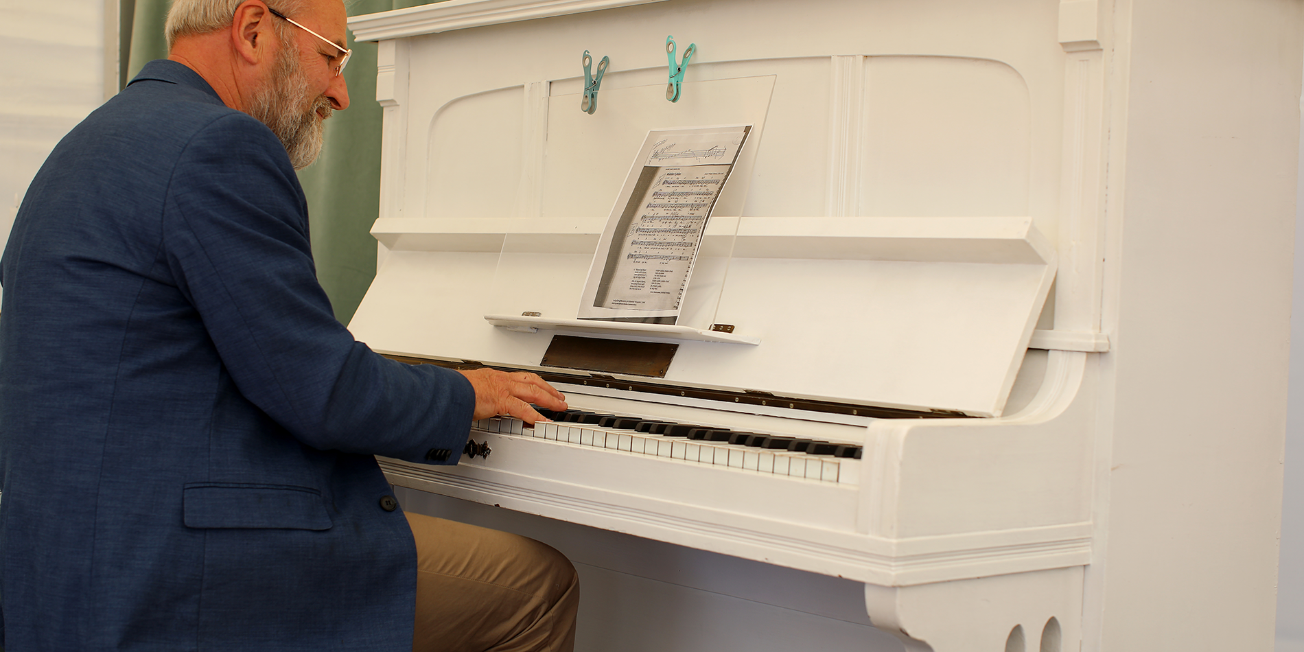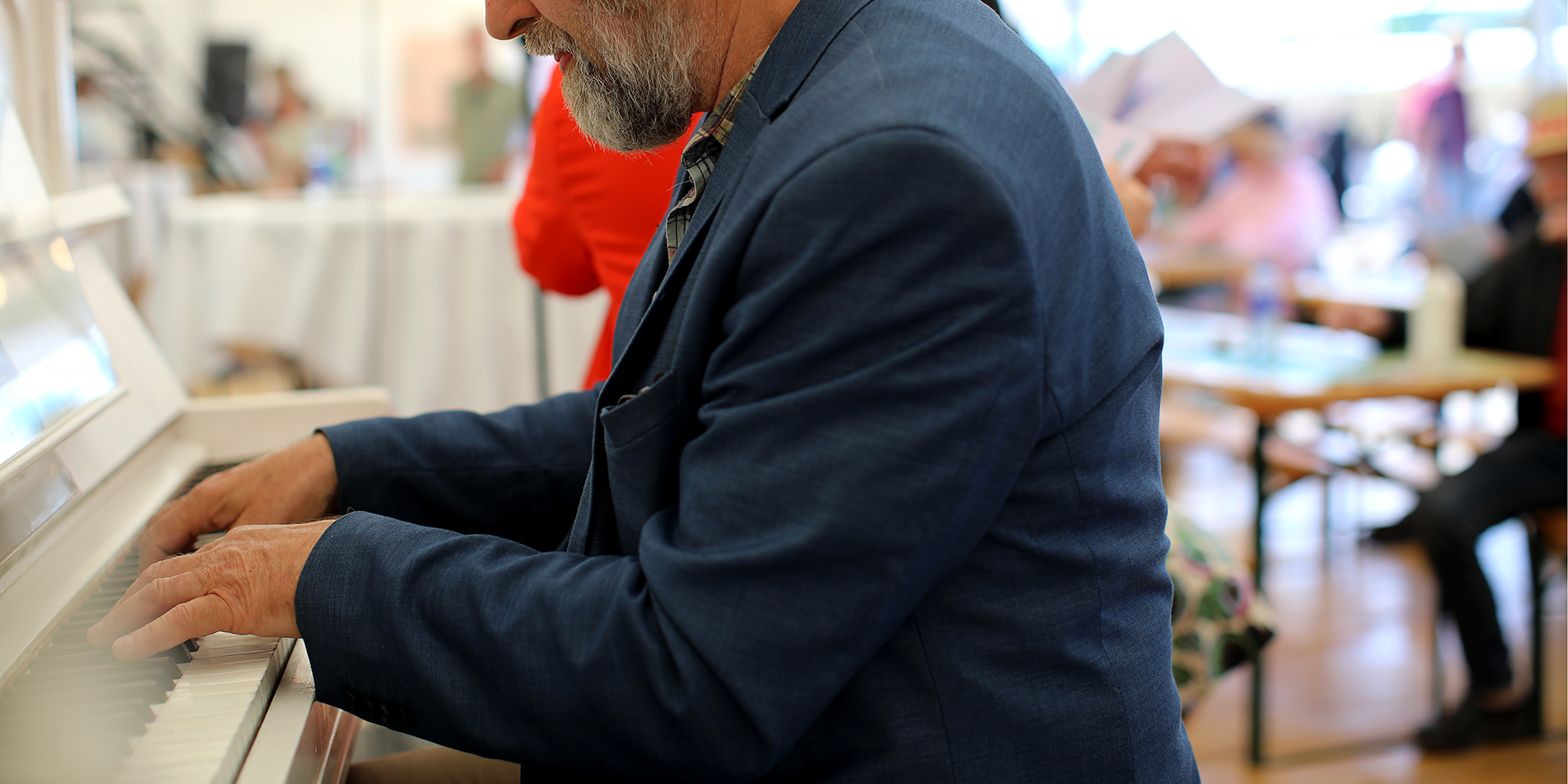 Vi synger fællessang med Carsten ved klaveret.